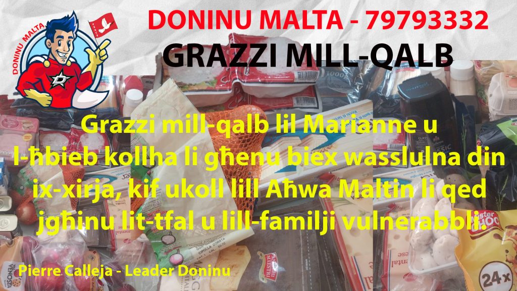 Nixtieq minn qalbi nuru l-apprezzament tagħna lejn Ms. Marianne Sacco, li flimkien ma’ sħabha, u bl-għajnuna tal-Partit Aħwa Maltin, tieħu ħsieb twassal ix-xirjiet lil Doninu (Malta) International, biex dawn jitqassmu lill-familji fil-bżonn.